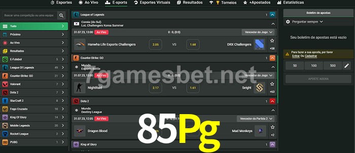 O 85Pg oferece uma grande seleção de opções de apostas em e-sports com probabilidades competitivas